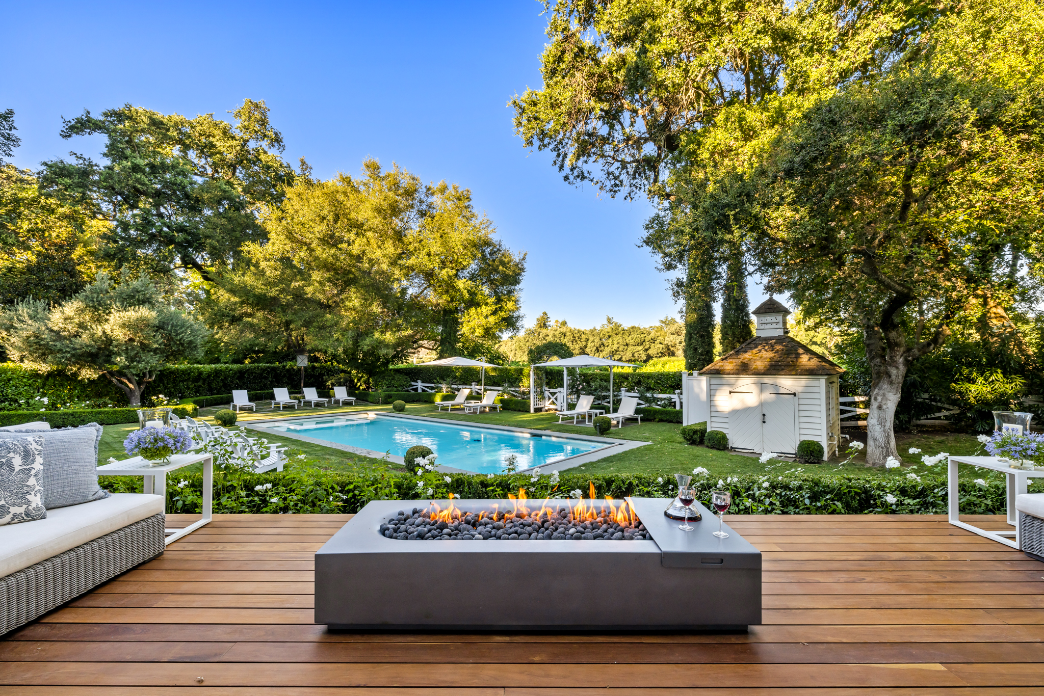 The residence includes six bedrooms, each with an ensuite or dedicated bath, along with formal living and dining rooms and a relaxed family gathering space. Outdoor amenities include wraparound decks, pool and spa, rolling lawn, pickleball court, gym, and outdoor kitchen.